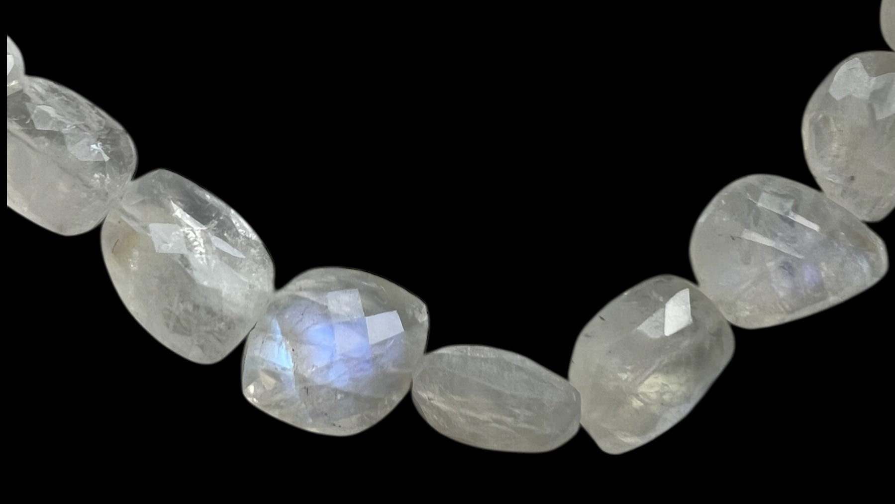 I hand fabricated this necklace, and it is one of my personal favorites. A little shorter than most, I sourced these AAA quality moonstone beads myself, and did not want to dilute them with any other gemstones. It is about 15 inches long and sits perfectly about the neck. It's a very versatile piece. What makes these moonstones so great? Their size is about 12-14 mm but does vary as they are rough nuggets. Moonstone is an orthoclase, and the mysterious blue glow is from a mineral called albite. Said to be made of captured moonbeams this necklace and easy opening clasp is the perfect gift for a June baby, as moonstone is the alternative birthstone to pearl. Moonstone represents femininity, protection and intuition.