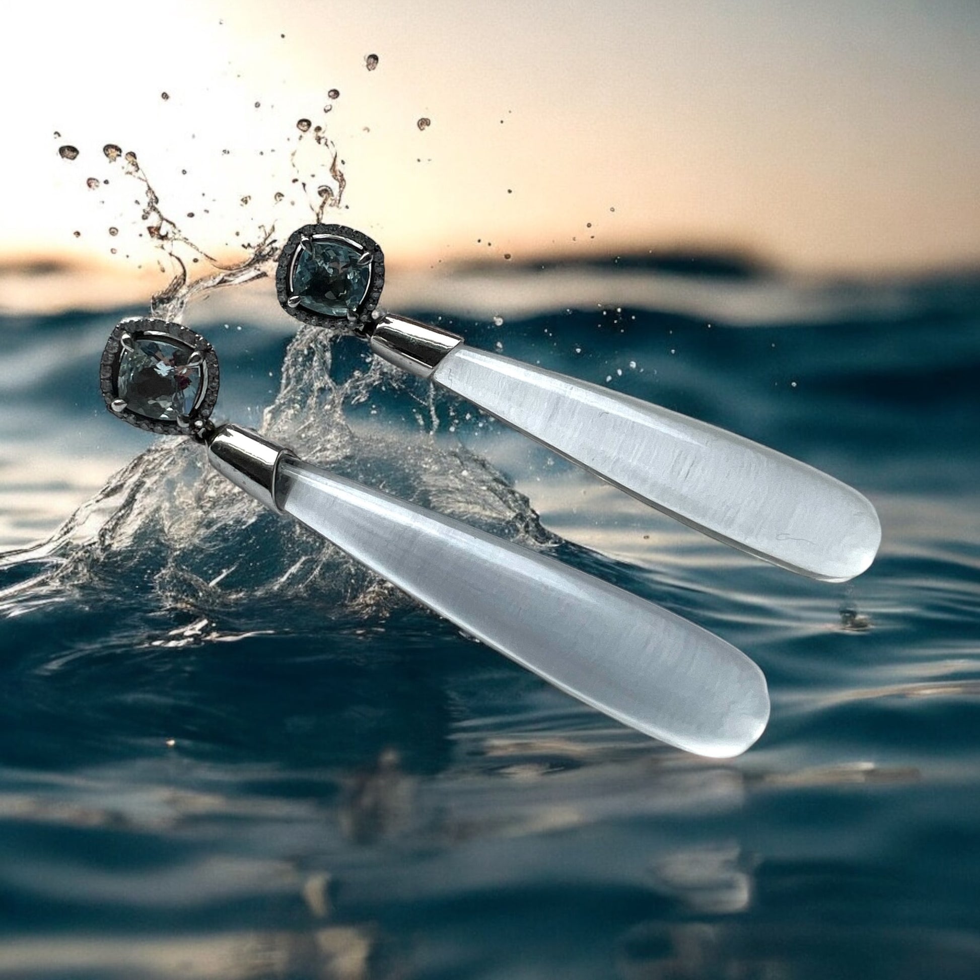 These hand cut rock crystal drops are perfectly clear and exceedingly rare. I had the 6mmx6mm cushion aquamarines custom cut in Thailand. 18K white gold surrounds the stones with a halo of high quality round white diamonds. Note that I put the opposite asymmetrical top on each earring, so that they properly mirror each other. One of a kind. Designed by me, and locally fabricated. Beryl necklace not included.