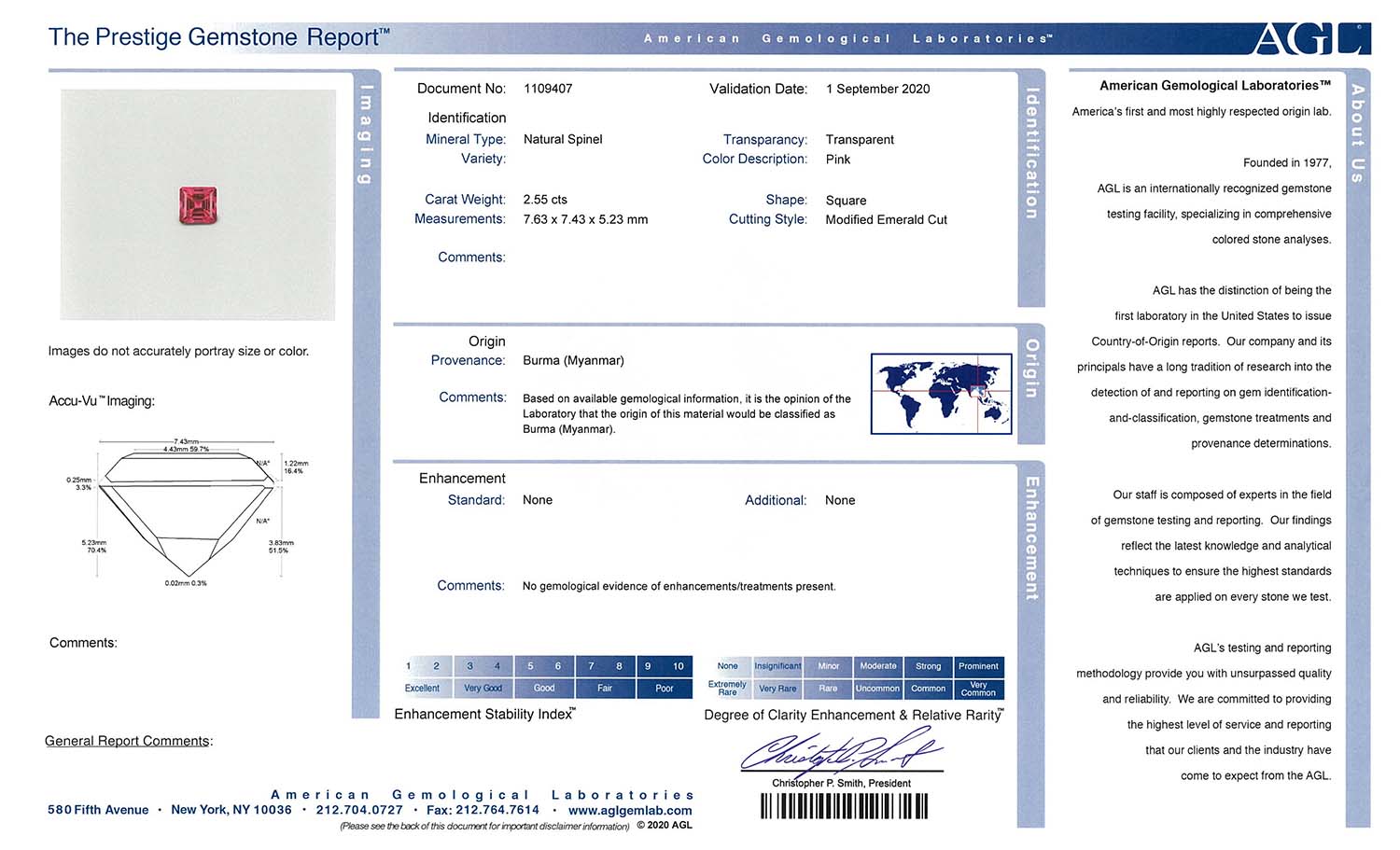 This beauty is an all natural eye clean, deep evenly colored, pink spinel with an AGL certification. It is 2.55 carats in weight and measure 7.52 x7.29x5.14 deep. Beautifully cut this material is the finest there is and exceedingly rare.