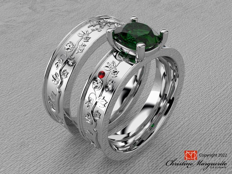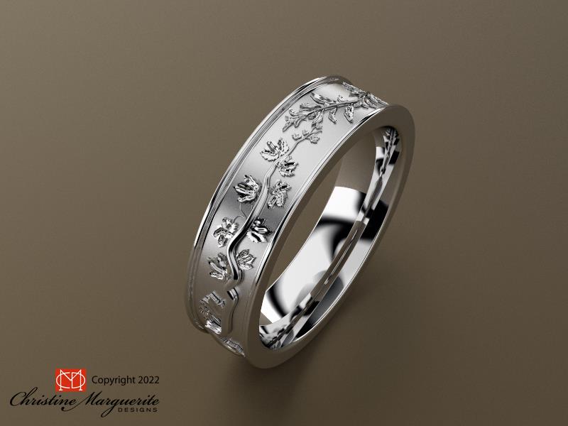 These motifs join two people together. One is a sommalier, and the other is an herbalist. Each person is working with plants, but in different realms. They each get represented in their rings. The CAD's for this design were off the hook!