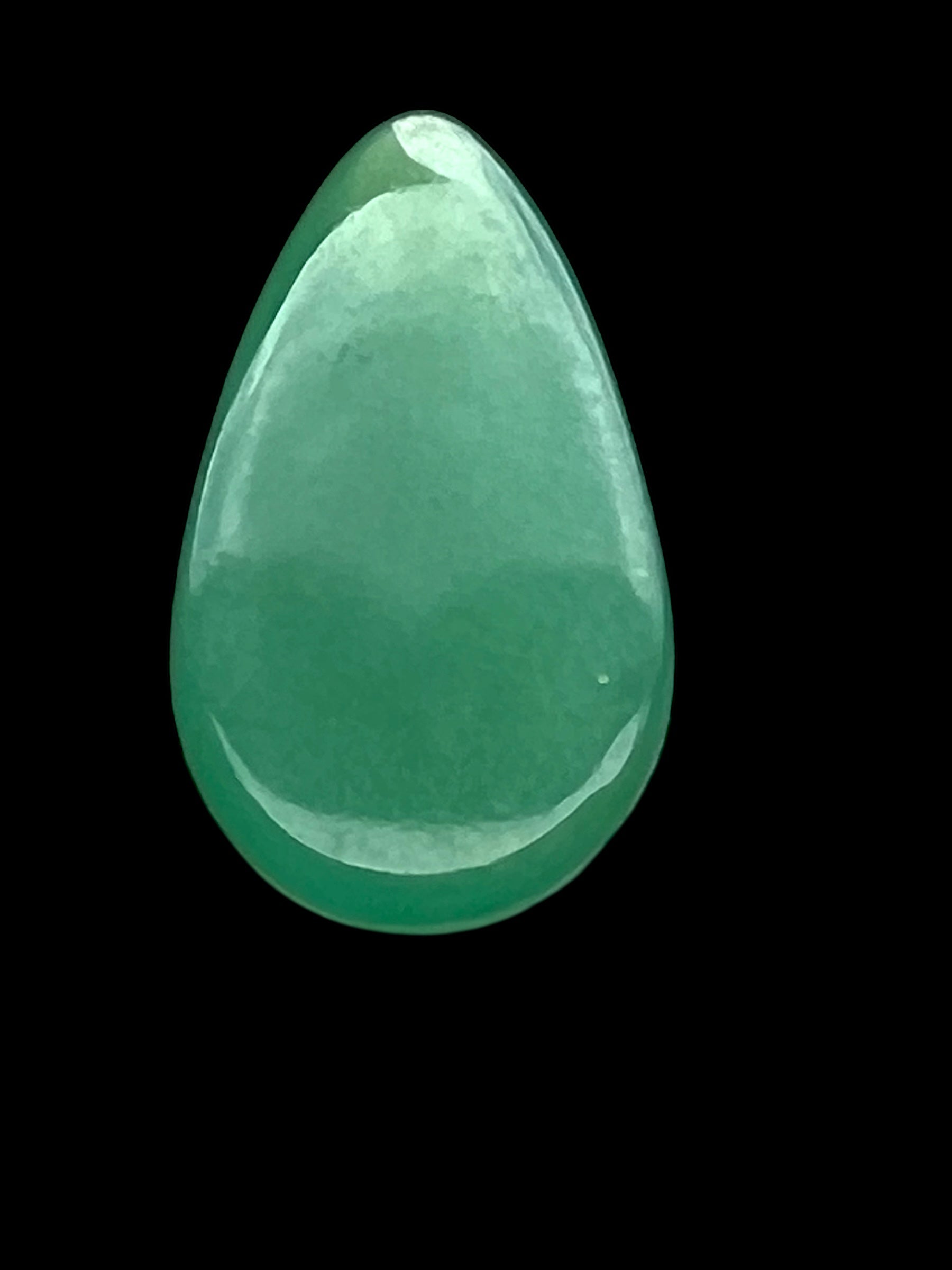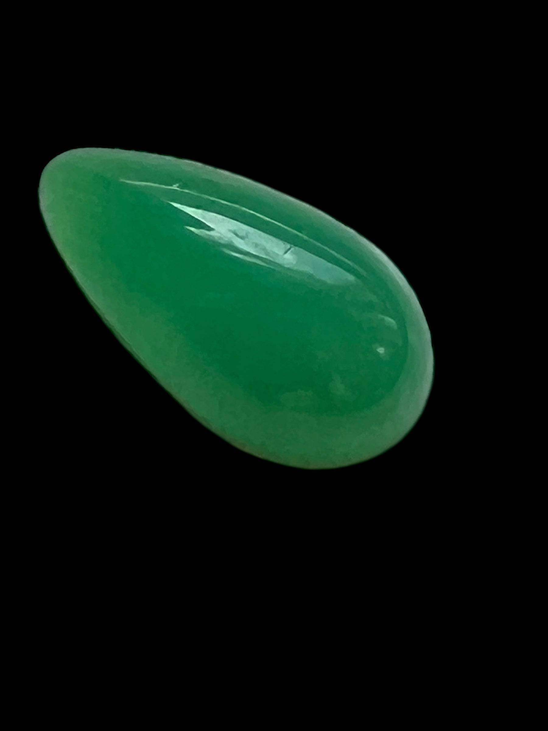 This chrysoprase is handcut in a beautiful teardrop shape. It measures 21mmx12mm and is 6.8mm deep. It is uniform in color, and completely untreated. The source is most likely India.
