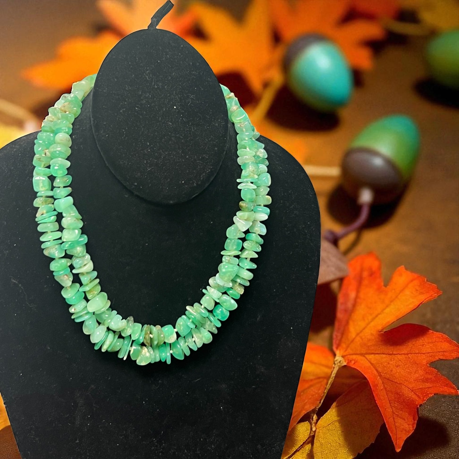 Chrysoprase is the alternative birthstone to emerald for the May birthday. The length is 18" and will fit most.