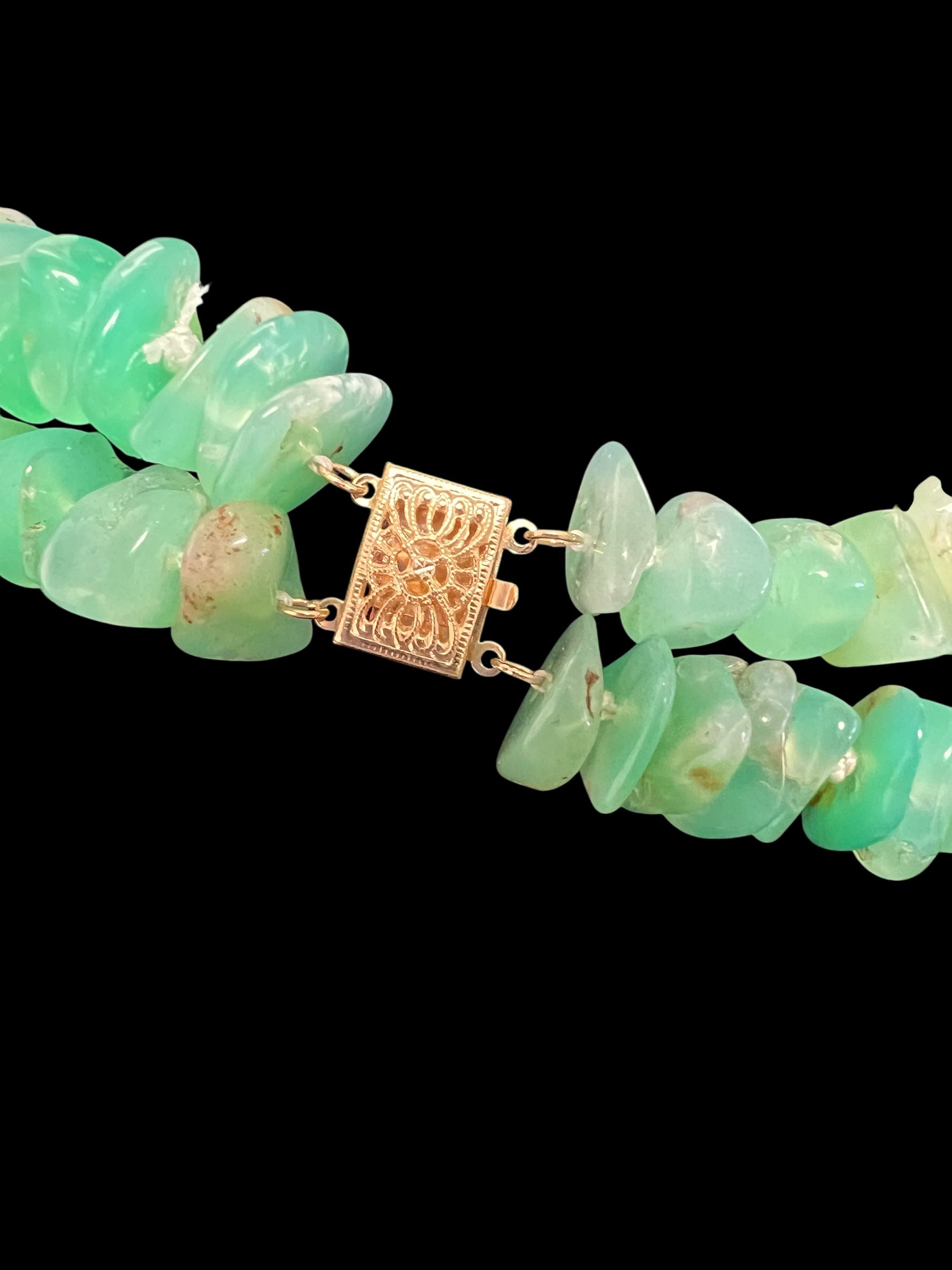 Chrysoprase Double Strand hand knotted necklace with goldfill filigree clasp
