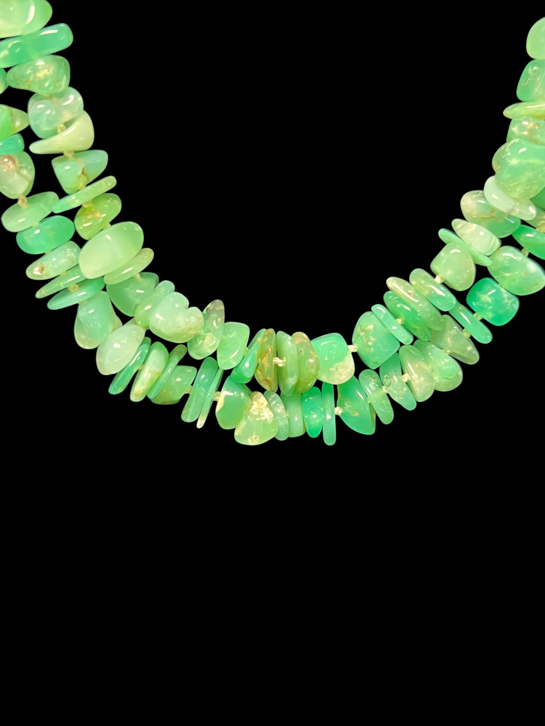 Chrysoprase is a form of cryptocrystalling quartz and is a form of chalcedony. This rough nugget double strand necklace drapes perfectly together, and is lovingly hand knotted in our studio on Kevlar. The translucence of this gem is striking. The filigree clasp is a feminine detail that is secure and attractive.