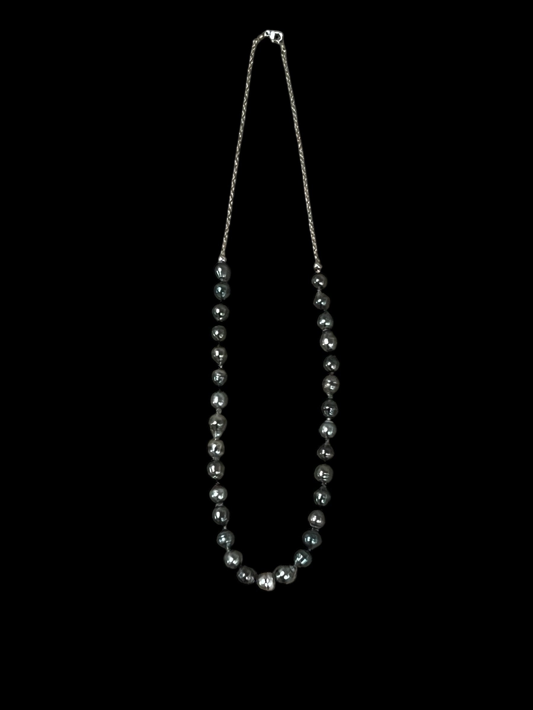 These pearls were harvested on the docks of Papeete in French Polynesia in the salt water of Tahiti. Grown in the mollusk, Pinctada Margarita Fera, which is a black lipped oyster, these 9mm pearls are naturally colored in the ranges from silver to charcoal black. The nacre is iridescent with tones of greens, blues and burgundy. They are lovingly harvested by locals and highly regulated by government for quality as they are some of the only items produced in this area of the world. We drill every pearl, and I hand knot them on Kevlar cord for durability and safety. I laid out the serendipitous colors according to shape and size. Most Tahitian pearls are 8-9mm in size and these are organic, naturally colored, and are salty to the tongue. I connected them to a solid 14K white gold cable chain,with 2, white gold bead accents on each end. The total length of this stunning necklace with the lobster clasp is 21" long.