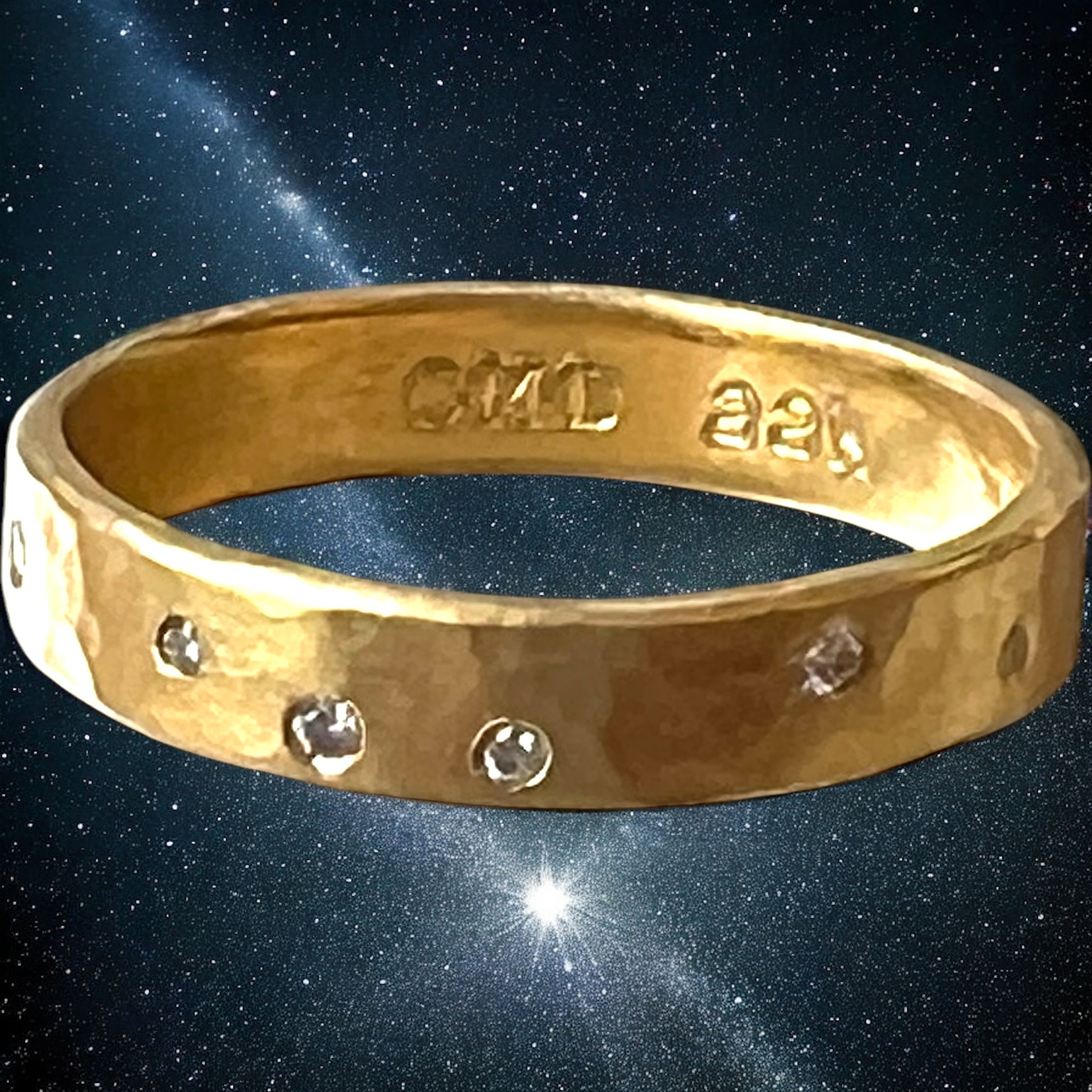 I wanted this ring to have the feeling of being unearthed at an archeological site. We actually made and karated the gold. 22KY gold is over 90% pure gold, and hammering the surface has a buttery feel to it. I used a planishing hammer to create the soft unfocused hammer marks. Scattered about are 9 round flush set natural white diamonds, which give it a little bit of sparkle, and references the night sky. This ring is 4+ mm wide, and just thick enough for the diamonds to tuck in. Size 9 Signed by my studio and stamped 22KY