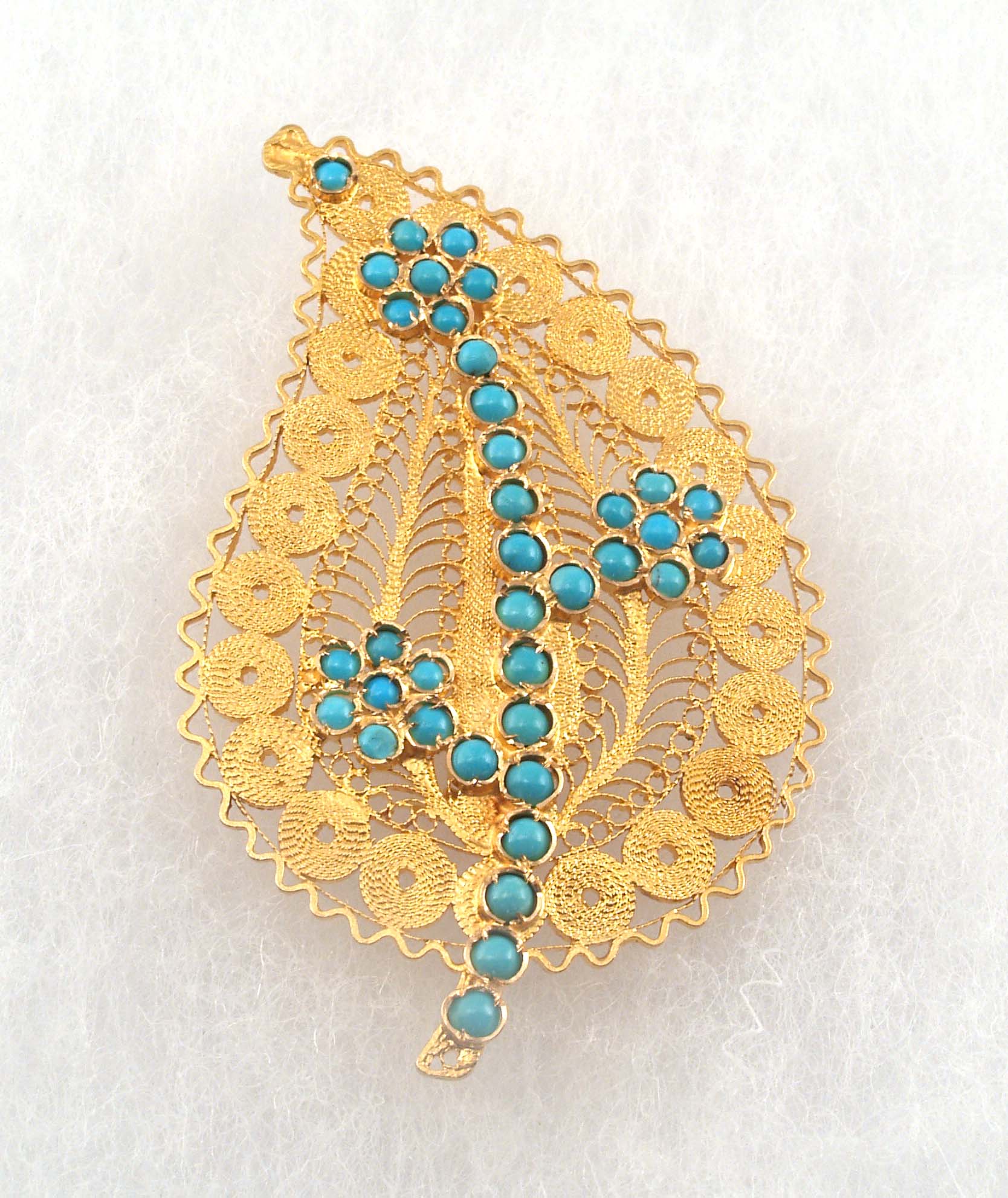 Stunning high karat gold filigree pin with 38, 3mm round turquoise cabochons bezel set in a flower motif on top of the leaf. The pin appears to be hand wrought and the box is original. Purchased by my client's family in the Middle East in the 1960's. Excellent condition no known damage, pin works perfectly.