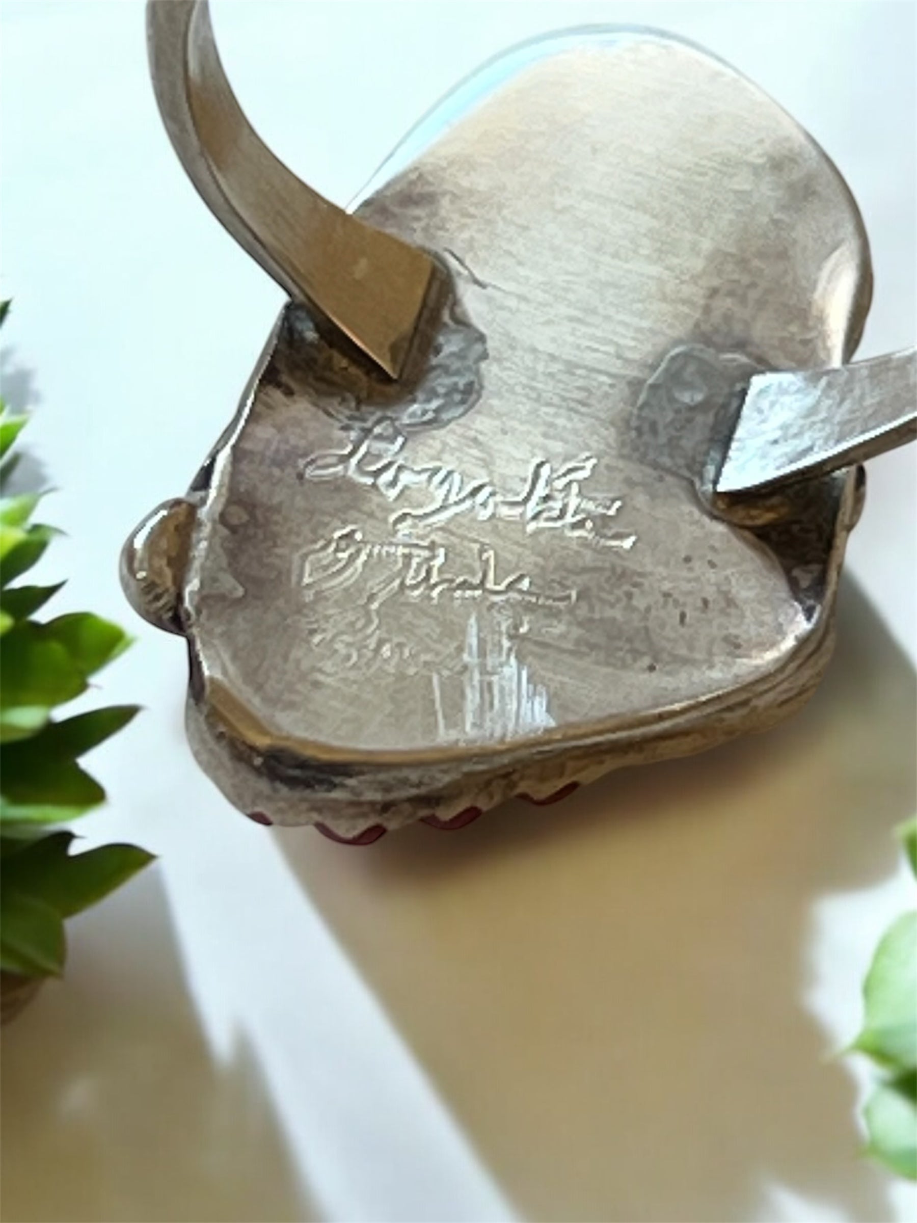 Working in the Zuni tradition Loyolita Tsatte is a renouned jewelry artist, known for her fetish carvings in turquoise and coral . This ring is hand signed, and features a carved turquoise leaf, tucked in with a carved coral accent. In Native symbolism, turquoise represented the sky, and coral represented the red of the earth. Coral was introduced into the Native American jewelry in the 1500's with the Spanish, and Moroccan influence. Beautifully carved, and crafted this ring is sized at a 10.5