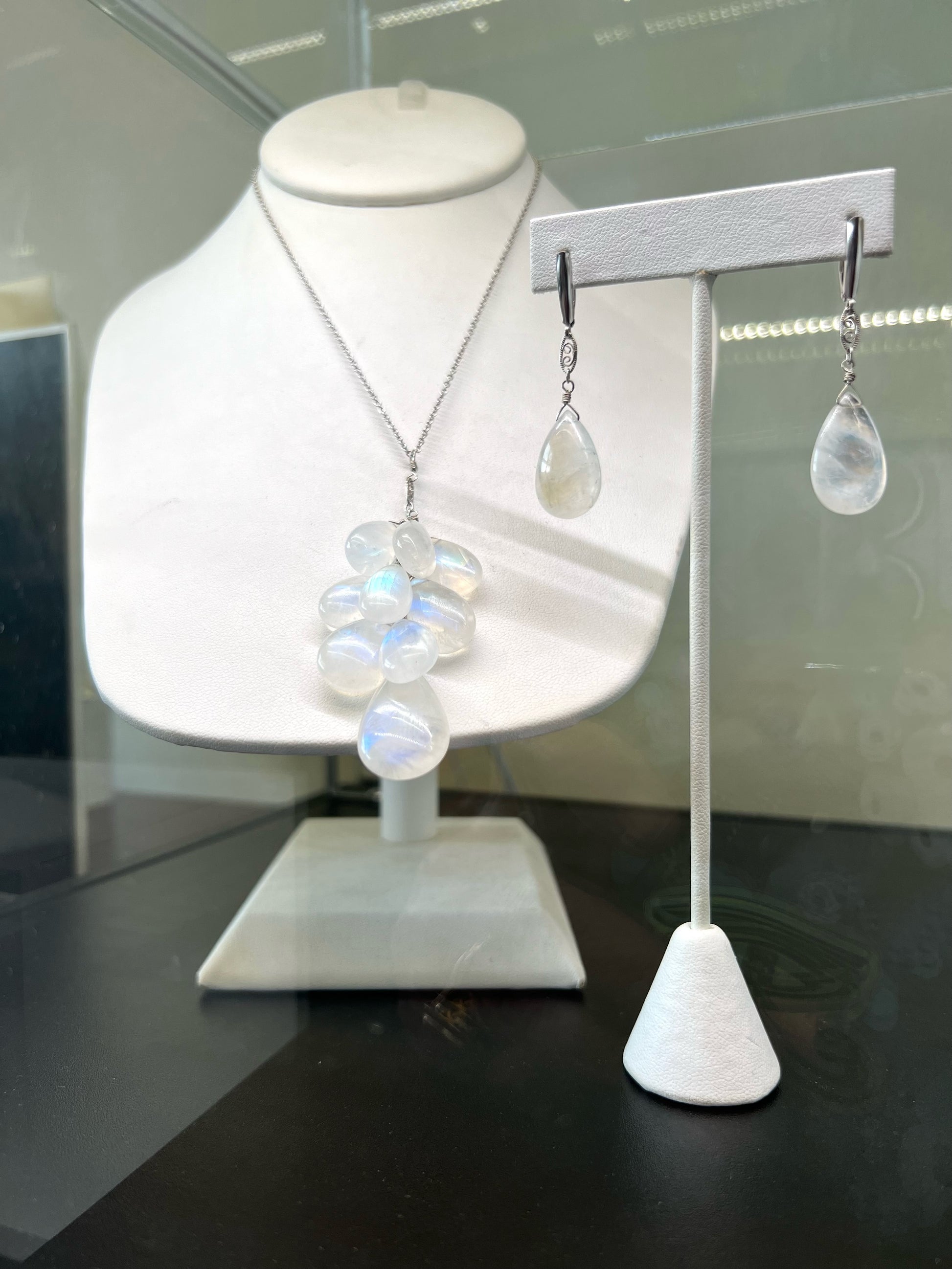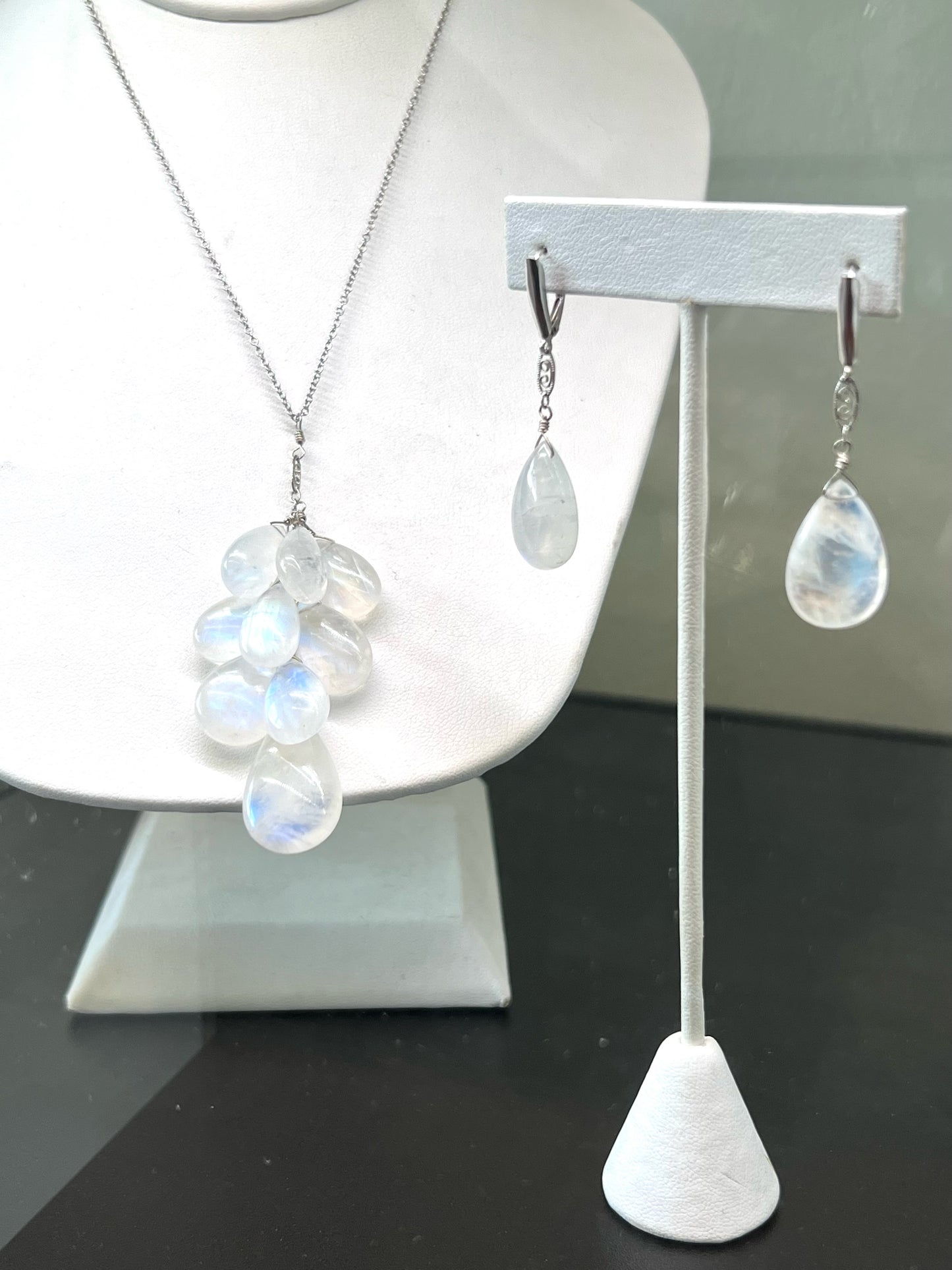 Moonstone Teardrops 14K white gold handmade necklace and leverback earrings