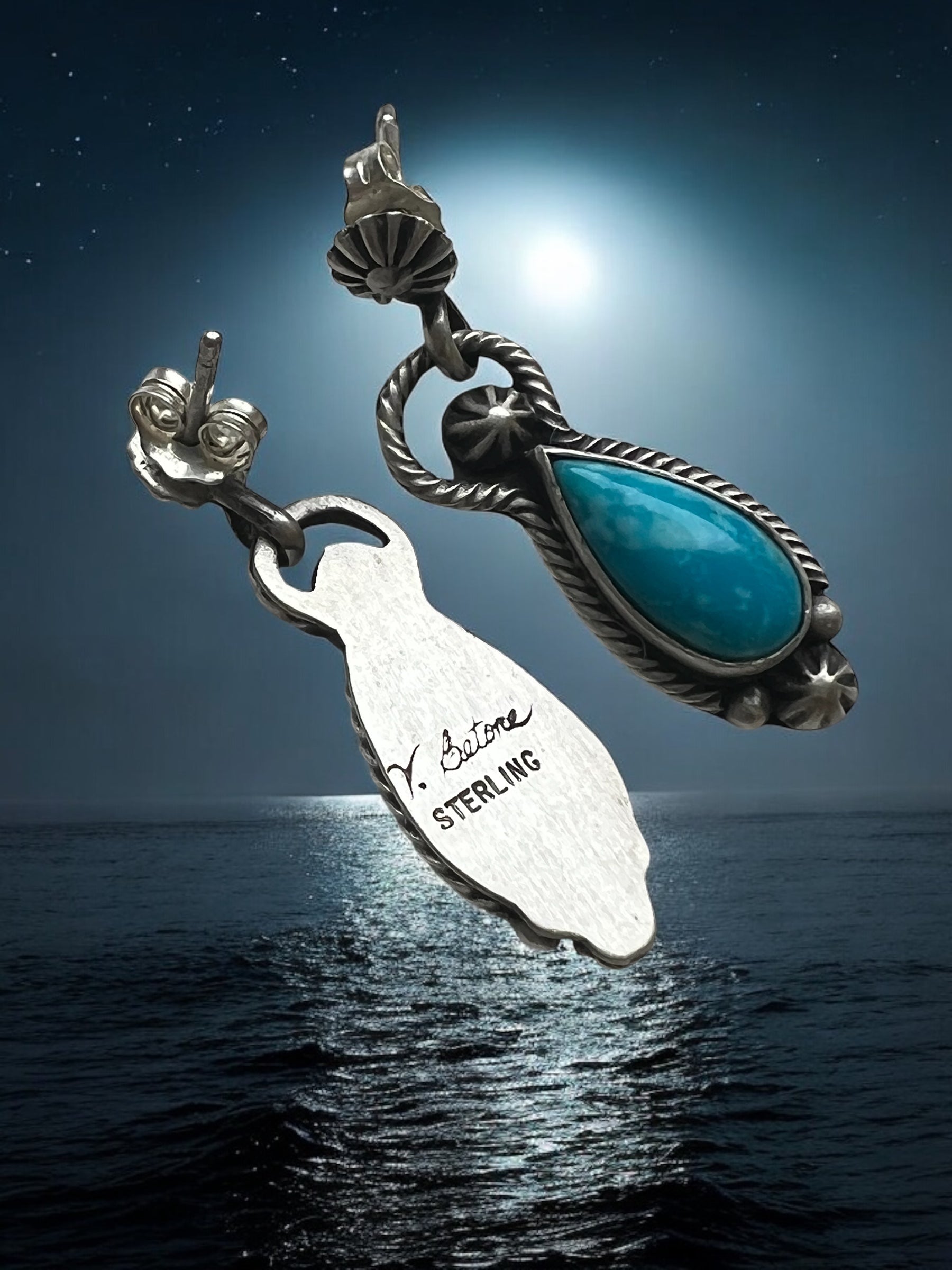 A Dine/Navajo artist from New Mexico is all we can find on Betone Verley. He is well known in the jewelry community for his fine craftsmanship. The turquoise (possibly Sleeping Beauty) teardrops hang beautifully from a loop and squash blossom detail. Secured with a sterling silver post, these earrings are 30mm long and are perfect for everyday.
