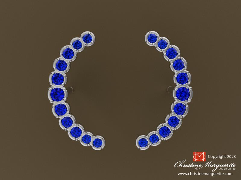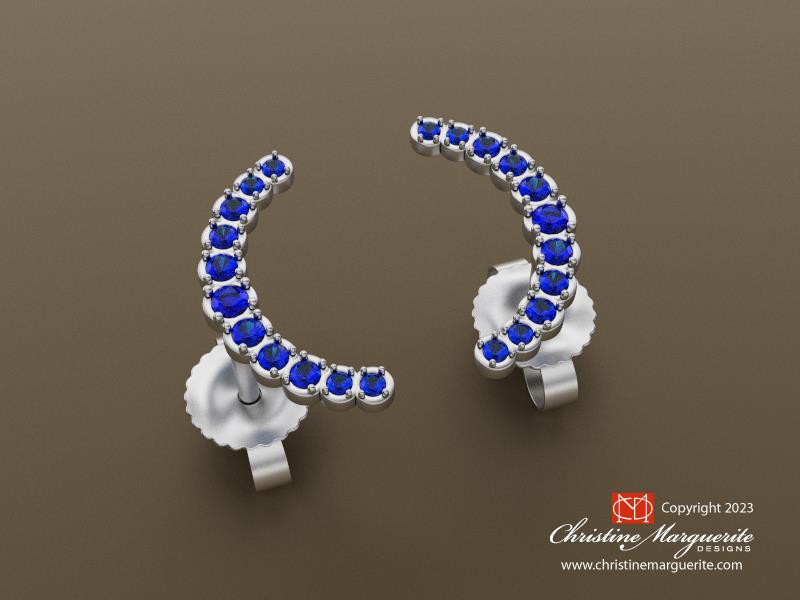Sparkling blue sapphires graduate in a crescent shape on a post earring. The sapphires range from 1.00 mm to 1.5mm. The length tip of the moon to the bottom is 18mm long so these waxing and waning, mirror image, sapphire earrings are impressive in size! Posted today on August 30th 2023 the full blue moon that has Saturn close by!
