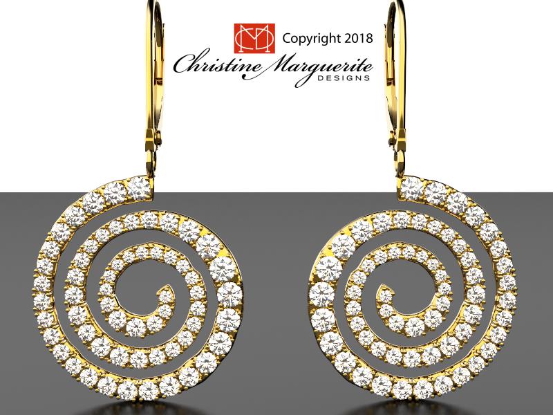These 18KY graduated diamond earrings hang perfectly from a leverback earwire. Light but with a big personality, this design represents the spiral of the universe. All natural quality diamonds arevhand set and all of our work is locally produced.