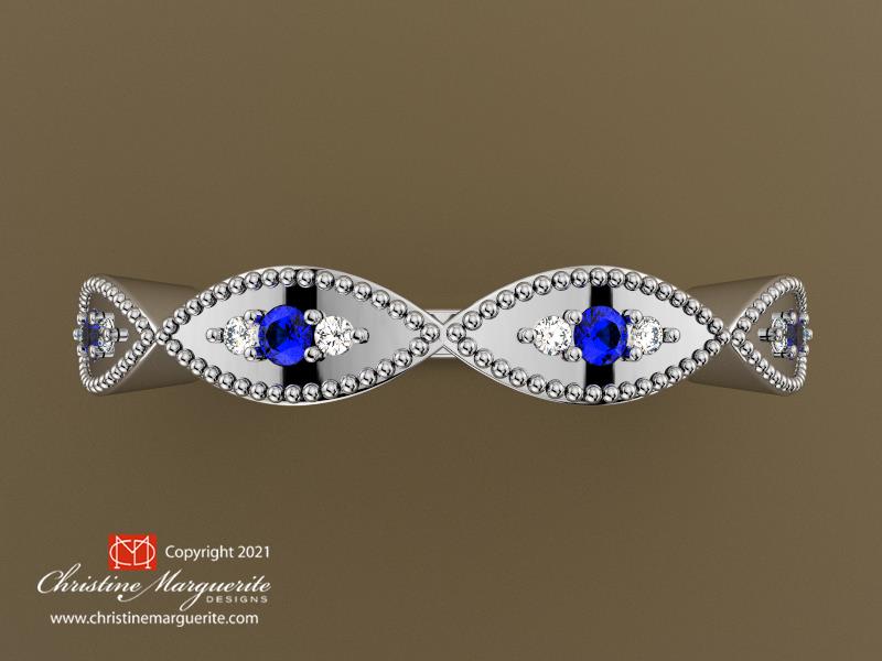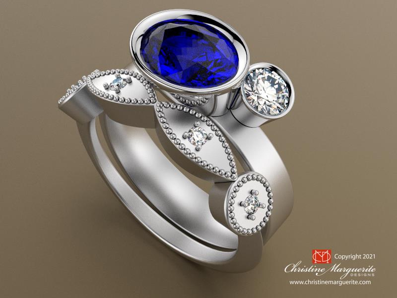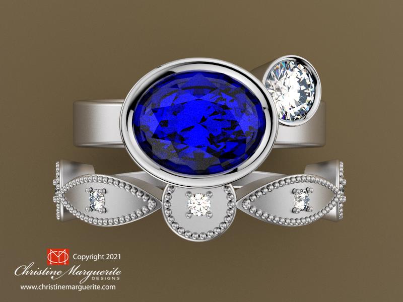 Oh how I love this setting. This is an East West bezel setting in platinum on my flare tapered band. My client had a sentimental diamond from a grandmother that she wanted to use, and loves asymmetry in a design. It all came together perfectly, and when we added the Vintage band it was so beautiful. This is truly a fine art setting.