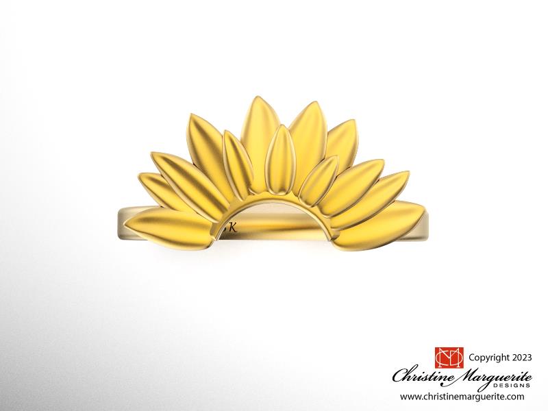 I am seeing a trend in tracer bands. I wanted to put a spin on this idea, and create a setting that looked like a sunflower. Here is one side of the flower. This band can be put around a variety of different shaped center gems, but is designed to go with our Black Diamond Engagement Ring. Locally cast in 18KY gold this tracer band reminds me of every late summer in Colorado. The fields of sunflowers out east are spectacular.